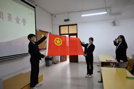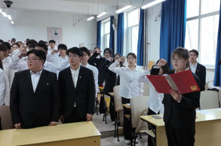 在团委组织部部长刘懿萱的领誓下,全体新团员面向团旗,举起右拳,庄严宣誓。铿锵有力的誓言响彻会场,既是对共青团组织的郑重承诺,更是对初心使命的坚定告白,彰显着新时代青年对党和国家的无限忠诚。