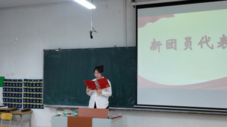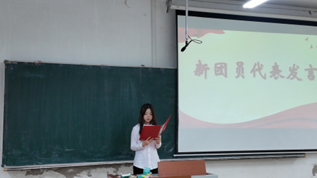 2025级张钰雪作为老团员代表分享心得。她勉励新团员们,要始终保持青春的热忱与昂扬的姿态,牢记入团初心,扛起团员责任,传承共青团艰苦奋斗、甘于奉献的优良传统,将个人理想融入国家发展与民族复兴的伟大事业,用实际行动书写无愧于时代、无愧于青春的壮丽篇章。