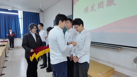 团委学生兼职副书记陈宇霆依次为新团员佩戴团徽。熠熠生辉的团徽,镌刻着共青团百年征程的荣光,凝聚着一代代共青团员的理想信念,更寄托着团组织对青年一代的殷切期望,在新团员胸前闪耀着信仰的光芒。