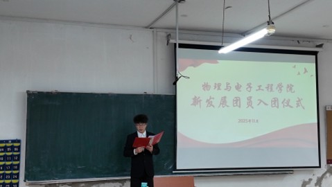 为深入学习贯彻习近平新时代中国特色社会主义思想,全面落实党中央群团工作会议精神,持续加强共青团组织建设,着力优化团员发展质量,11月5日,物理与电子工程学院2025年下半年新团员入团仪式在理工二号楼211室举行。学院团委负责人闻烨出席仪式。