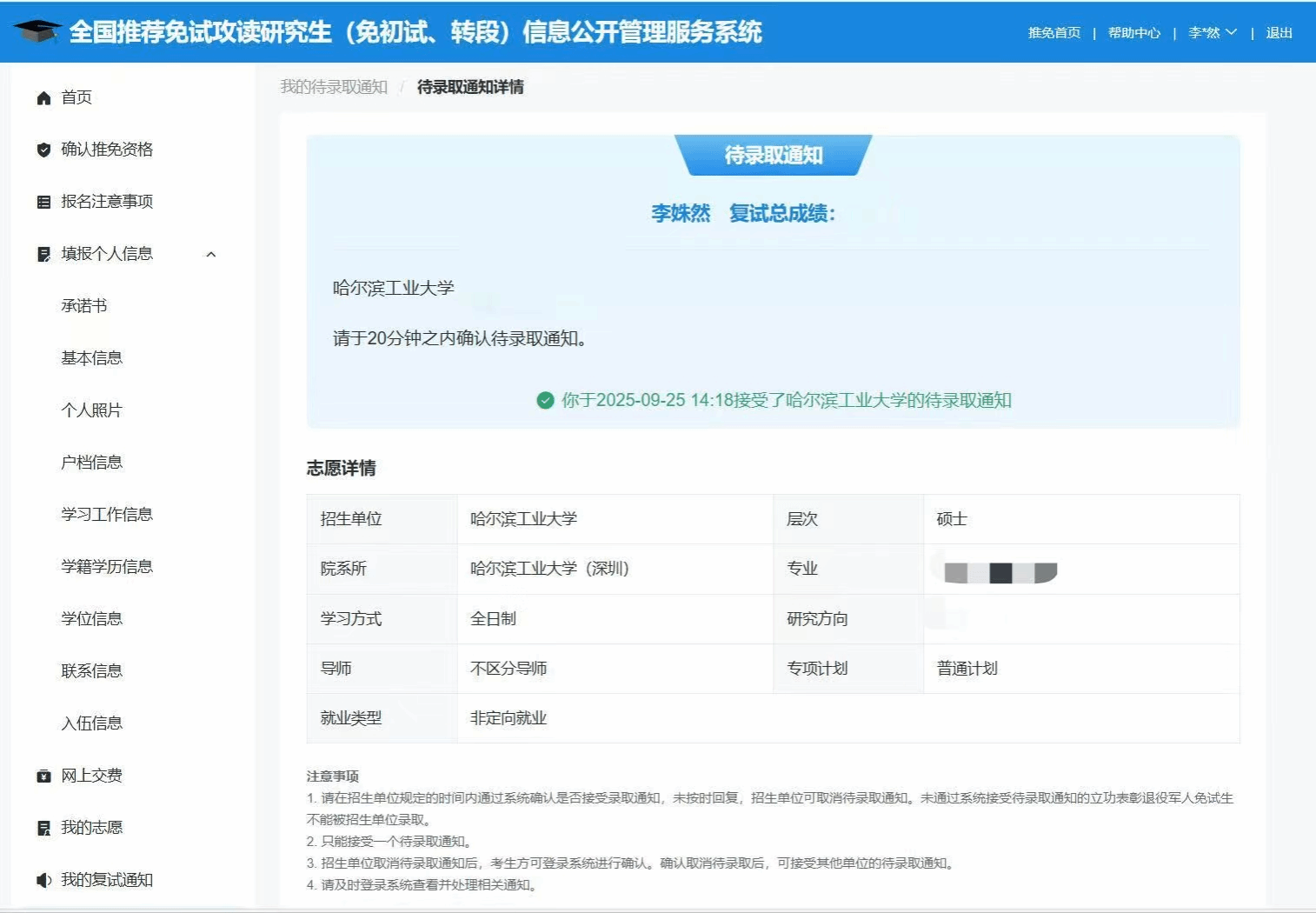 在之后的预推免阶段我也陆陆续续地投递了许多院校,参加了很多院校的面试,有些我认为能进面试的院校拒绝了我;有些我只是尝试投递,却给我发了面试通知;有的我认为面试时表现得一塌糊涂,最后却收到了录取通知;有的我自我感觉良好,甚至有老师来联系我,最后却告诉我没有被录取;也有的院校在面试前我感觉信心满满,最后却遗憾落选。说这些只是想告诉学弟学妹们,在推免阶段你有无数次的机会,也有无数种可能,不要因为一次的失败就沮丧,不要因为一次的拒绝就失落,我们只需要坚定一个想法:这个学校不行我还可以尝试其他学校。