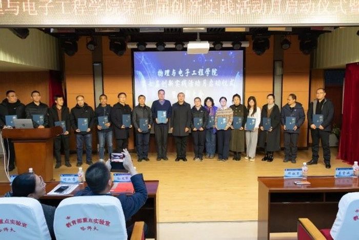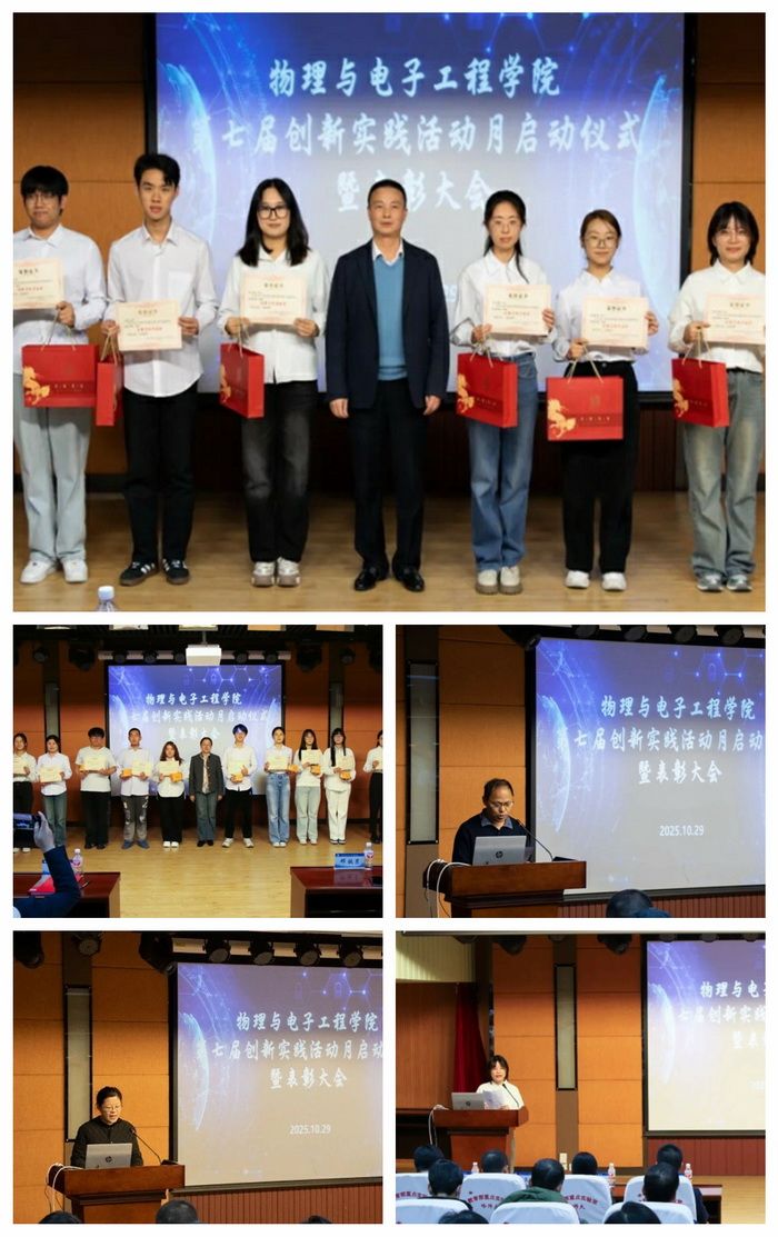(张鑫瑞/文)为深入学习贯彻习近平总书记关于科技创新的重要论述,深入贯彻落实学校第十三次党代会精神,推进五育并举,全面激发学生的创新兴趣,提升科学文化素养,10月29日下午,物理与电子工程学院第七届“创新实践活动月”启动仪式暨表彰大会在科学会堂一楼报告厅举行。学院党委书记邓铁男、院长孙文军、副院长付淑芳,以及各系主任及师生代表参加本次活动。活动由学院党委副书记姜雪娥主持。