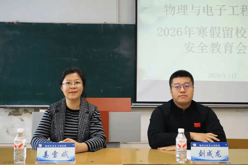 (孙彤/文)为切实增强寒假留校研究生的安全防范意识,保障寒假期间校园安全稳定,1月8日下午,物理与电子工程学院2026年寒假留校研究生安全教育会议在理工二号楼211室召开。学院党委副书记姜雪娥出席会议并讲话,全体寒假留校研究生参加会议。研究生辅导员刘成龙主持会议