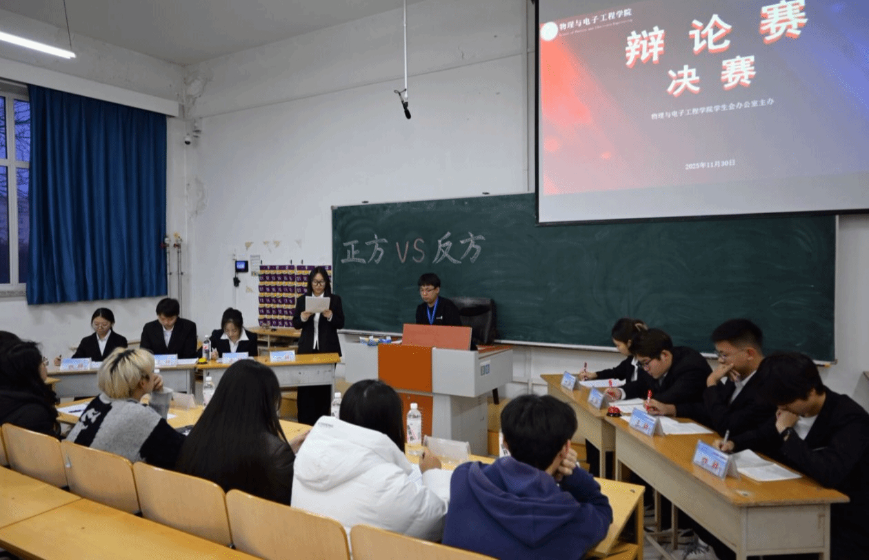 (王子玉/文)为丰富校园文化生活,提升学生思辨与协作能力,11月16日到11月30日,物理与电子工程学院2025级新生辩论赛顺利举办。本次辩论赛分为初赛、复赛、决赛三个场次,辩手们围绕多领域辩题展开激烈交锋,展现出卓越的思维素养和表达能力。